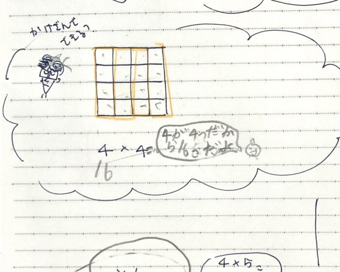 みかんちゃんを書いて、吹き出しに「4が4つだから16だね」と書いてくれました。