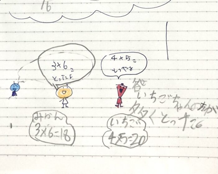 それぞれが「3×6ことったよ」「4×5ことったよ」と吹き出しに書き込みました。