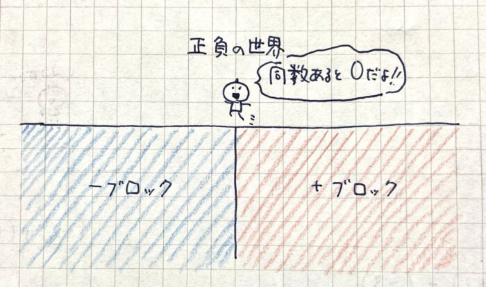 「正負の数の世界」とは、正の数と負の数が限りなくある世界です。簡単にいえば、-ブロックと+ブロックがきれいに別れてぎっしり詰まっている世界だと思ってください。