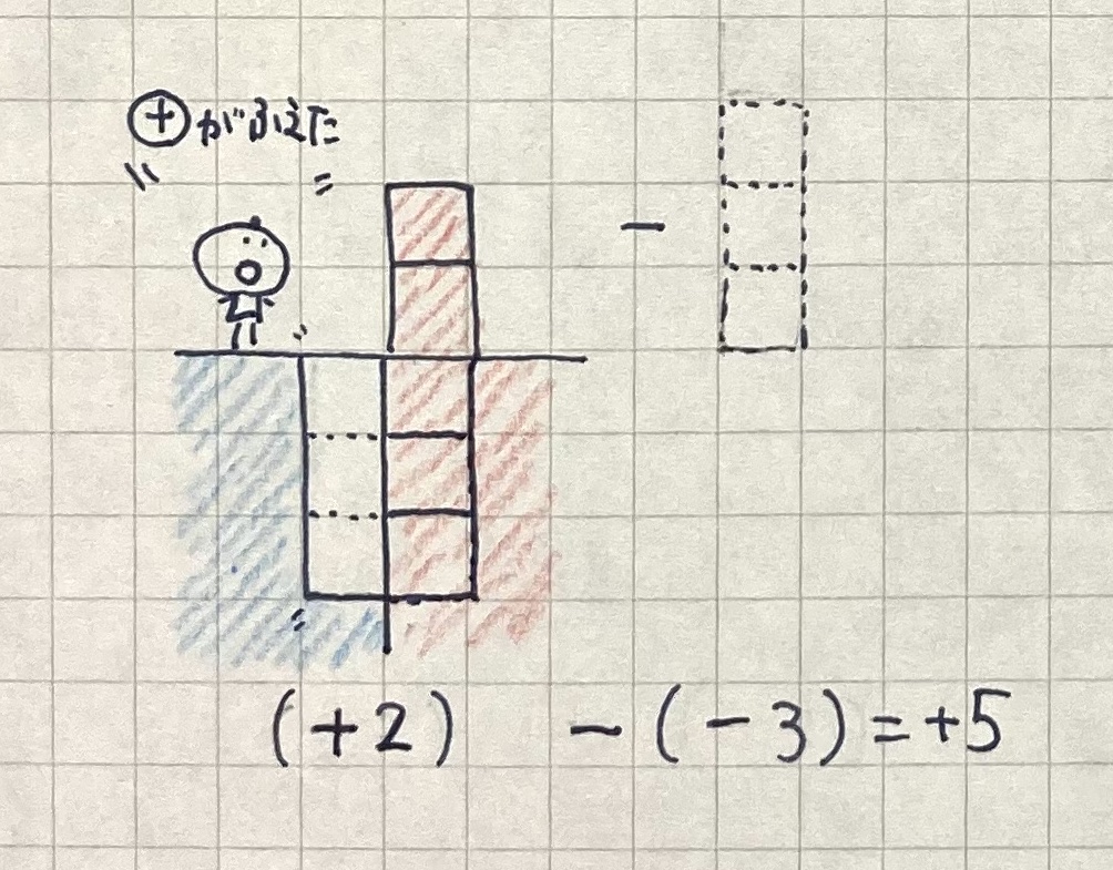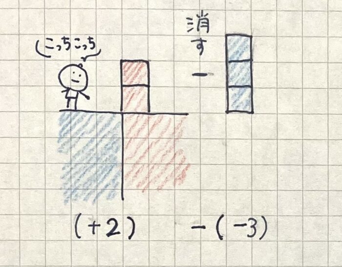 この(+2)の状態からマイナスブロック3個(つまり-3)消す。それはどういうことでしょうか。