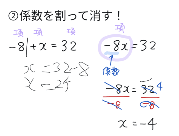 係数処理の場面でこのように教えました。文字の項につく係数で両辺を割るやり方です。