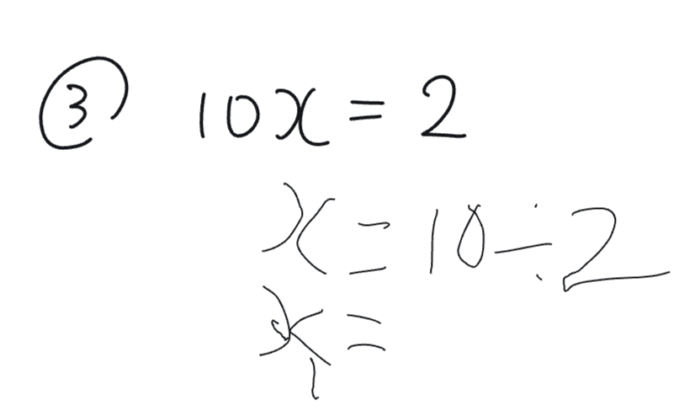 ここは「両辺をxの係数3でわる」と説明しました。ワーキングメモリが弱い(また基数性の概念が弱い)子は、分数を用いた処理が無難です。