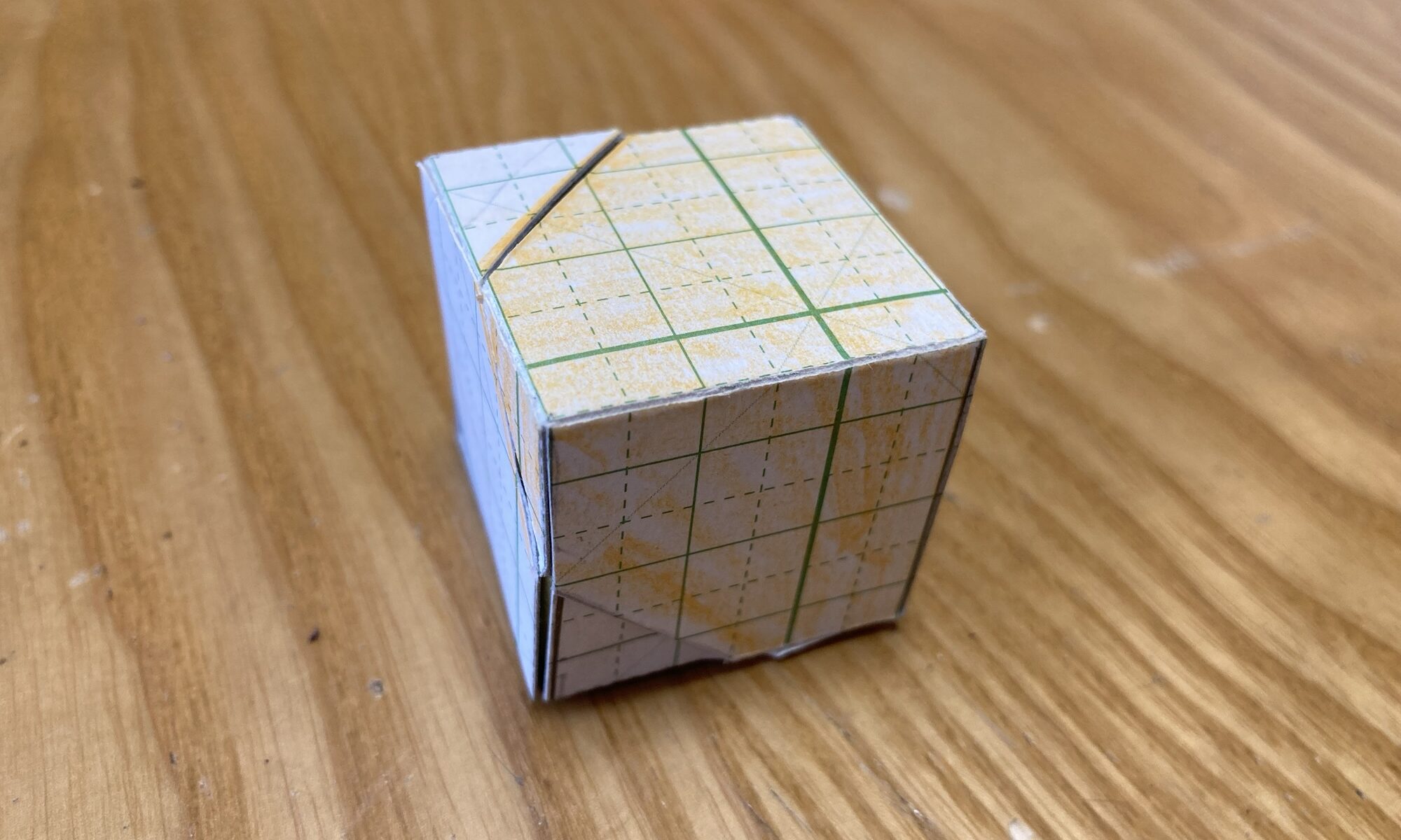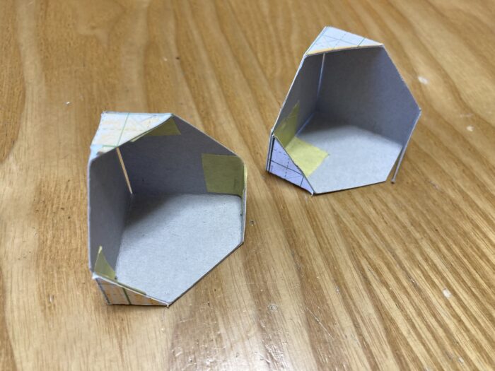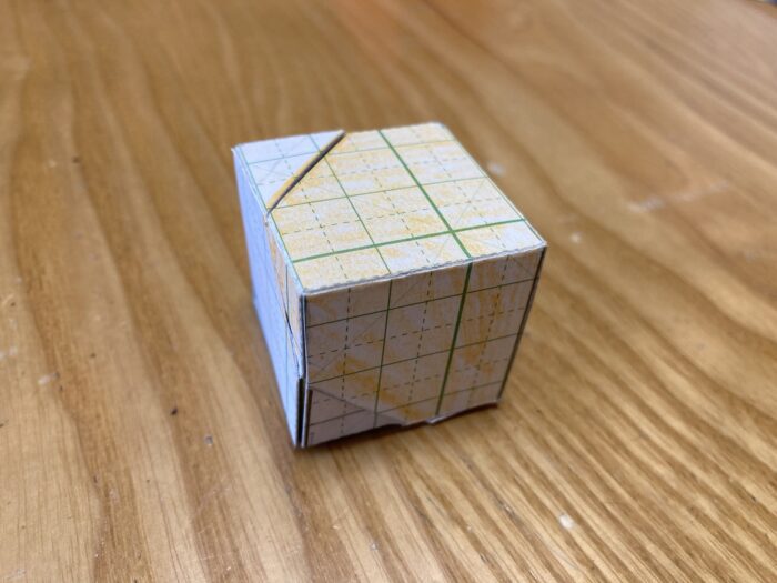 ぼくの方で展開図は作っていますから、あとはこの斜め線の部分だけ切って、組み立てればいいです。