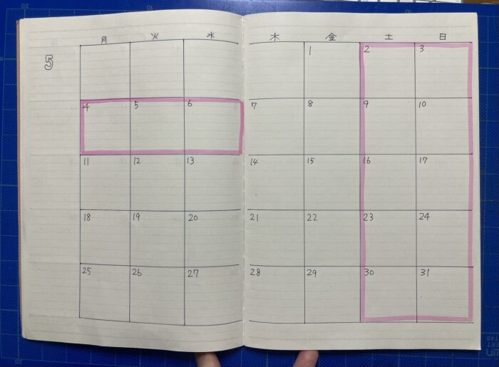 大学ノート(B5サイズ/6mm)を見開き1ページに、1ヶ月分のカレンダーを書きます。縦に5列、よこに7行の線を引く。曜日・日付を書く。これで終わりです。